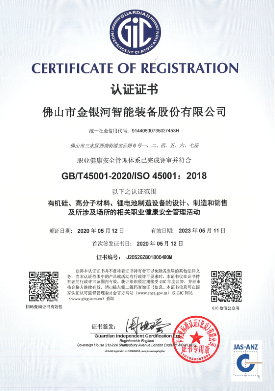 2020年5月,免费P站看片“職業健康安全管理體係”完成評審並符合GB/T45000-2020/ISO 45001:2018,認證範圍包括免费情P站APP大全、高分子材料、鋰電池製造設備的設計、製造和銷售及所涉及場所的相關環境管理活動。
