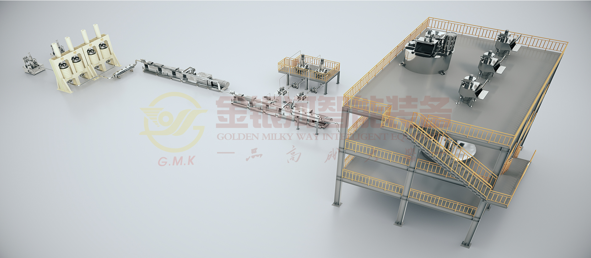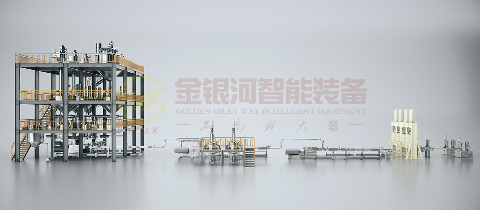 由計量鬥、稱量及輸送係統、貯罐、冷卻器、多工位出料機、喂料機、網式過濾器、雙螺杆螺旋混合機、輔助設備及DCS中央控製係統組成。原材料(粉體與液體)通過精確的計量係統在線自動和連續輸送到一階螺旋混合機中,在一階螺旋混合機中完成混合、分散、研磨、抽真空等產出基料後進入二階螺旋混合機再到三階螺旋混合機,中途克服解決了物料的物料粘度高峰,通過在線助劑至其中,完成混合、分散、抽真空等完成品料製作並輸出進入多工位出料機暫存,多工位機出料機輪流交替出料過濾包裝。它的生產效率高,適合大規模生產;它具有自動化程度高,杜絕物料直接接觸空氣,產品質量穩定性好,物料及能源損耗少等優點。